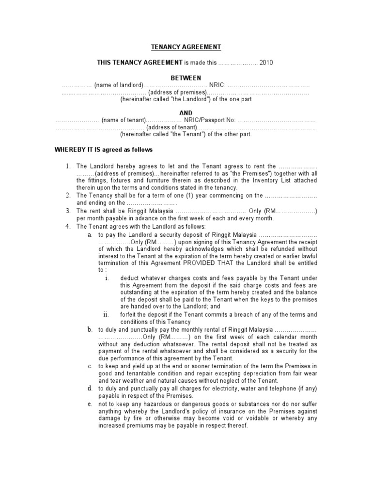This is a legal agreement between a landlord and a tenant that outlines the duties and. The above RM15360 is for one original copy of the Tenancy Agreement in which the Tenant will. 14 rows WITNESSETH AS FOLLOWS.